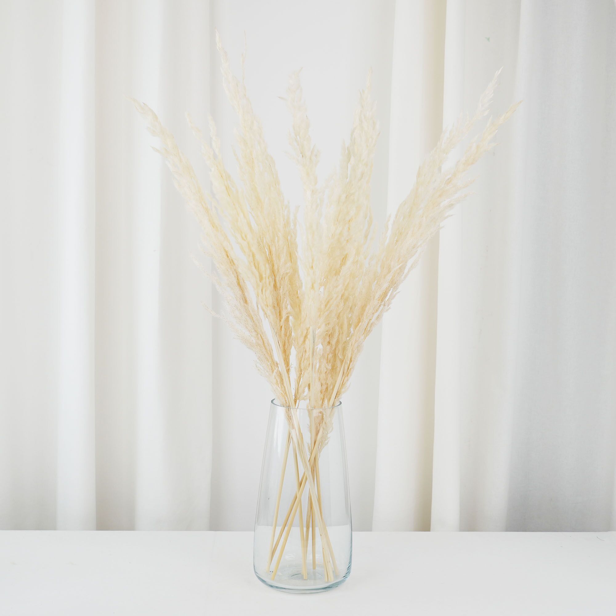 Torkat pampasgräs är noggrant behandlat för att bevara sin estetik och struktur, utan att du behöver vattna eller sköta dem. Vår torkningsprocess säkerställer torkat pampas i den finaste kvaliteten. Fördelen med torkat pampasgräs är dess hållbarhet: det kan förbli vackert i åratal. Pampasgräs är otroligt mångsidigt – perfekt att använda i vaser, som bordsdekoration eller var som helst du önskar en touch av natur.